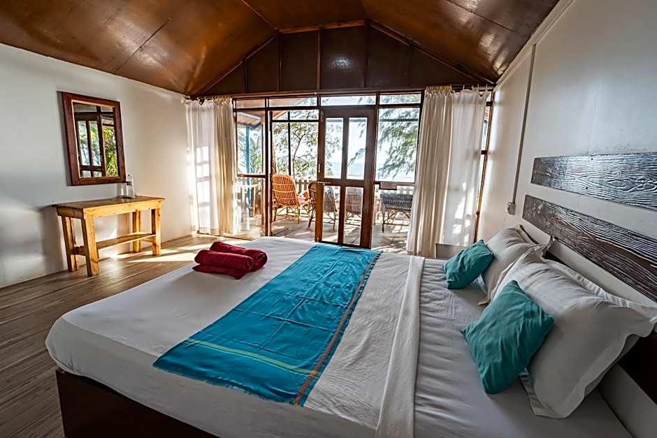 These glass-fronted, spacious cabins have a great sea view from their balcony. Set slightly further back than our Front Sea View Cabins, they sit in our maturing garden. They are simply decorated with a white interior, Indian textiles and cooling floor tiles. These huts are equipped with a king-sized double bed, high-quality mattress, ceiling fan, bedside table, shelving unit, dressing table and wardrobe. The bathroom is equipped with a western-style toilet, hot water shower and hand basin.